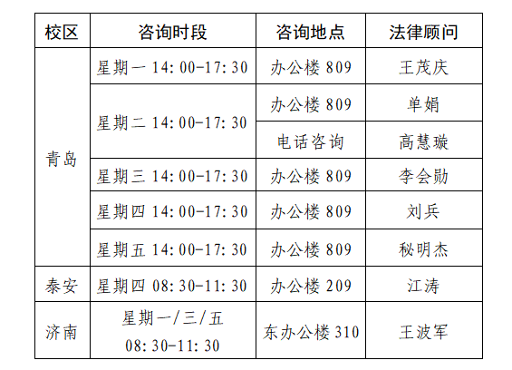 咨询一般通过“面对面”方式,情况特殊的也可电话咨询。为保证服务质量,请提前预约咨询时段。联系电话:0532-86057061(青岛)、0538-3076234(泰安)、0531-58863365(济南)。