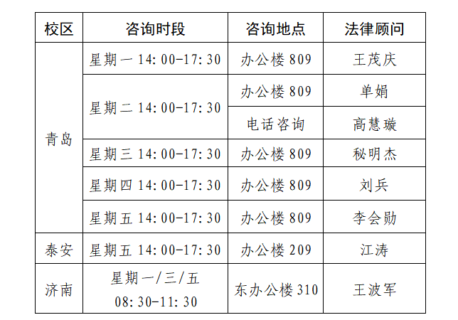 咨询一般通过“面对面”方式,情况特殊的也可电话咨询。为保证服务质量,请提前预约咨询时段。联系电话:0532-86057061(青岛)、0538-3076234(泰安)、0531-58863365(济南)。